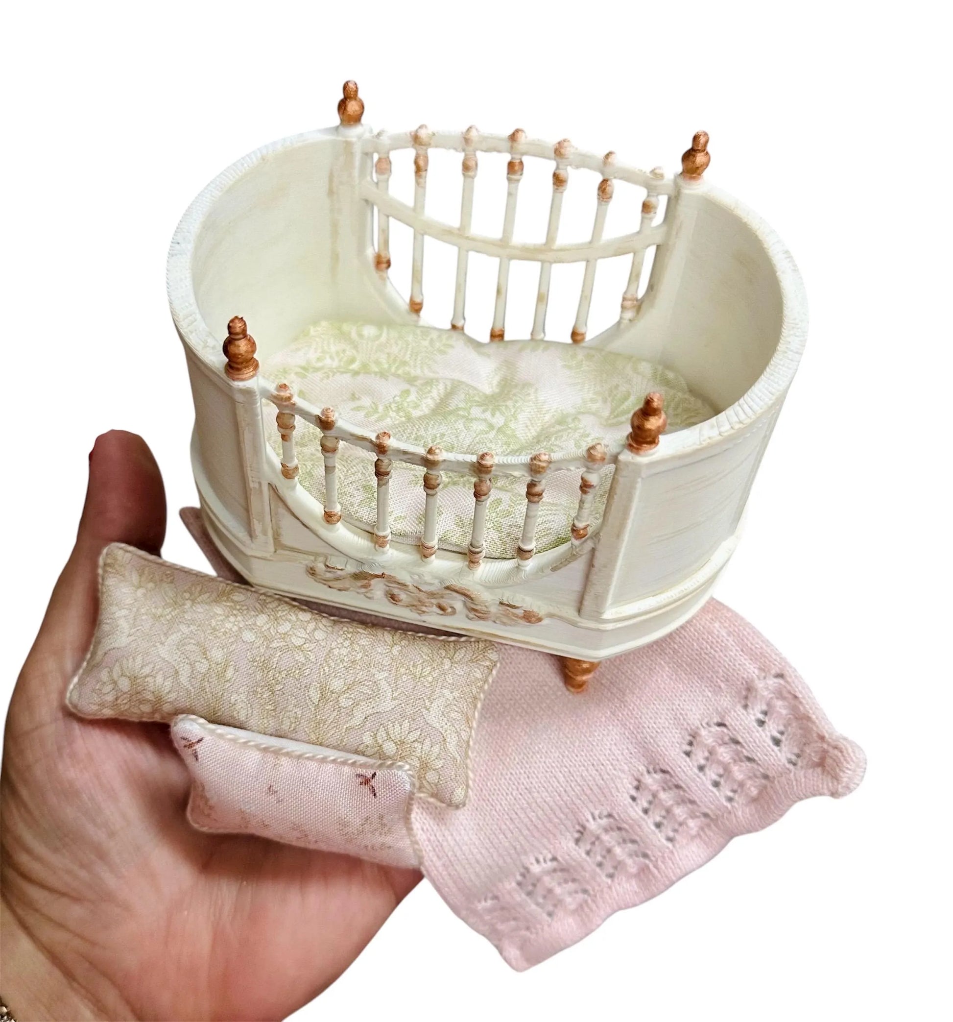 This listing is for a miniature 1:12 Scale dollhouse crib made to order. Includes bedding. The crib mattress /cushion is permanently adhered to the crib. Pillows and a knit blanket are loose.