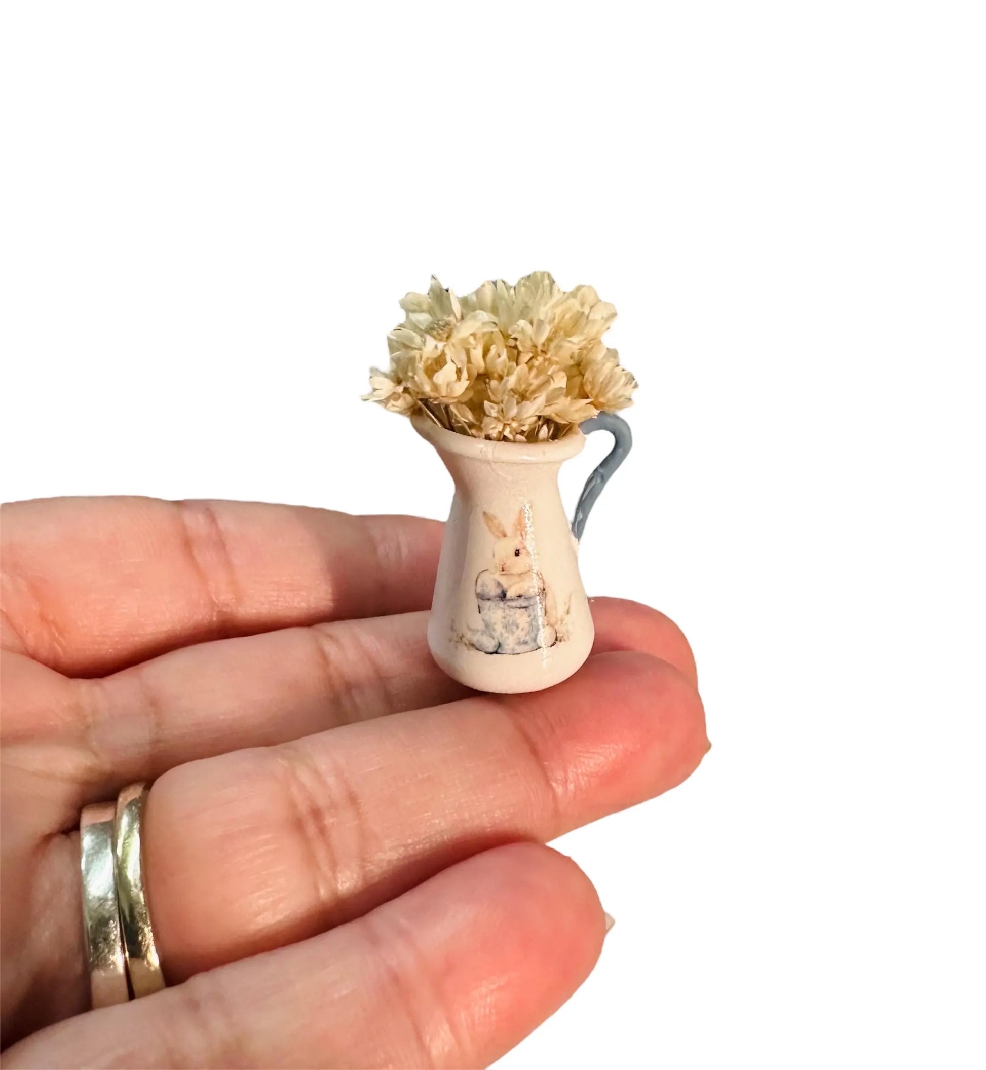 This listing is for a 1:12 scale miniature pitcher with real miniature flowers. The pitcher is made of resin with a pastel blue print. Measure approximately 1.39 inches tall.